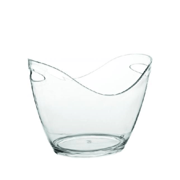 This clear cooler features a generous oval shape that comfortably holds up to six bottles with ice. The transparent design showcases the bottles inside, creating an attractive focal point for bars, drinks stations, and reception areas. It enhances your event styling by allowing labels and branding to remain visible while keeping beverages perfectly chilled.